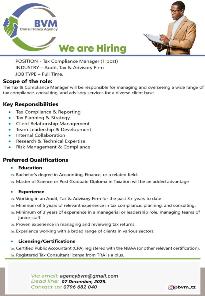 Tax Compliance Manager Job Vacancy at BVM Consultancy agency
